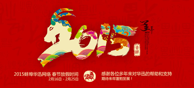 蚌埠華迅網(wǎng)絡(luò)科技有限公司2015新年放假時間為2015年2月16日至2月25日,假日期間如有需求請聯(lián)系:0552-3711772 15255232273