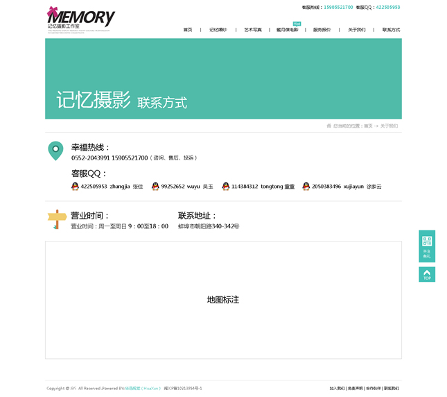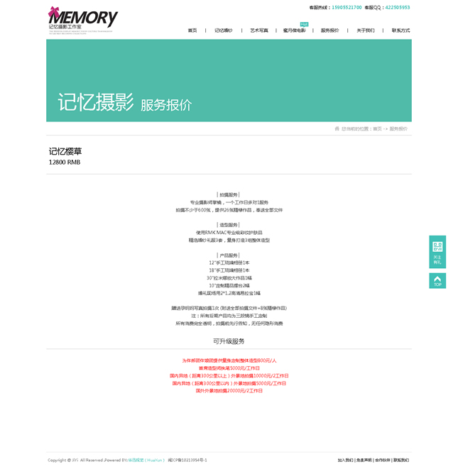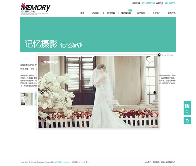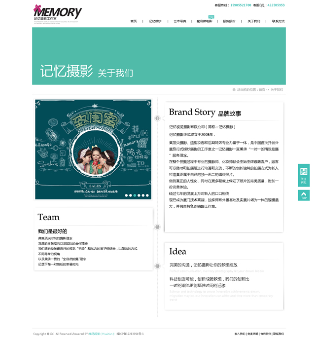 記憶視覺攝影有限公司(簡稱:記憶攝影)記憶攝影正式成立于2008年,集頂尖攝影、造型妝容和后期特效專業(yè)力量于一體,是中國首批開創(chuàng)外景旅行式婚紗攝影的工作室之一記憶攝影一直秉承“一對一的精致拍攝”服務(wù)理念。在整個(gè)拍攝過程中專業(yè)的攝影師、化妝師都會(huì)至始至終跟隨客戶,顧客可以隨時(shí)和拍攝組進(jìn)行溝通和交流,不斷的創(chuàng)新獨(dú)特的拍攝方式為新人打造真正屬于自己的獨(dú)一無二的婚紗照片。做到真正的人性化,同時(shí)在更多程度上保證了照片的完美質(zhì)量,附加一份完美體驗(yàn)。